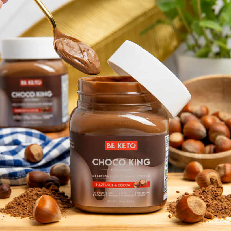 „Keto Cream™ Chocolate King“ – puikus pasirinkimas sveikos gyvensenos mėgėjams, siūlantis alternatyvą tradiciniam šokoladiniam kremui. Jame yra iki 90 % mažiau angliavandenių nei tradiciniame kreme, todėl galite mėgautis saldumynais nesijaudindami dėl cukraus kiekio kraujyje. Be to, jame yra 122 % daugiau baltymų, kurie padeda palaikyti fizinį aktyvumą. Lazdyno riešutai, naudojami „Keto Cream“ gamybai, yra gausus vertingų vitaminų ir mineralų, tokių kaip vitaminas E, B grupės vitaminai, kalis, kalcis ir fosforas, šaltinis. Didelis nesočiųjų riebalų rūgščių kiekis teigiamai veikia „blogojo“ cholesterolio kiekio mažinimą. Be to, natūralioje kakavoje yra antioksidantų, tokių kaip polifenoliai ir flavonoliai, kurie palaiko smegenų sveikatą ir tinkamą funkcionavimą. Šis produktas yra visiškai leidžiamas laikantis keto ir mažai angliavandenių turinčios dietos! *palyginimas susijęs su populiariausiu šokoladiniu kremu. Nuo šiol, kai tik užsinorėsite ko nors saldaus, rinkitės „Keto Cream Chocolate King“. Tai sveikas, saldus užkandis, puikiai tinkantis ketogeninei arba mažai angliavandenių turinčiai dietai. „Keto Cream“ idealiai tinka kaip priedas prie visų rūšių keto kepinių, blynų ar keto avižinių dribsnių. Jį taip pat galima naudoti kaip greitų pusryčių sumuštinių su keto duona ingredientą. Tai vienas sveikiausių ir saldžiausių užkandžių rinkoje. Tai vertingas skaidulų šaltinis, kuris suteikia sotumo jausmą ir mažina apetitą. Ingredientuose esantis inulinas pagreitina medžiagų apykaitą ir palaiko svorio metimo procesą! Tai saldus skanėstas, kurį privalote sau leisti! Atminkite – per dieną galite suvalgyti tik 2 šaukštus! Žinome, kad tai gali būti sunku.